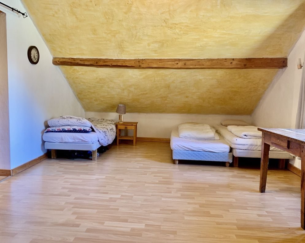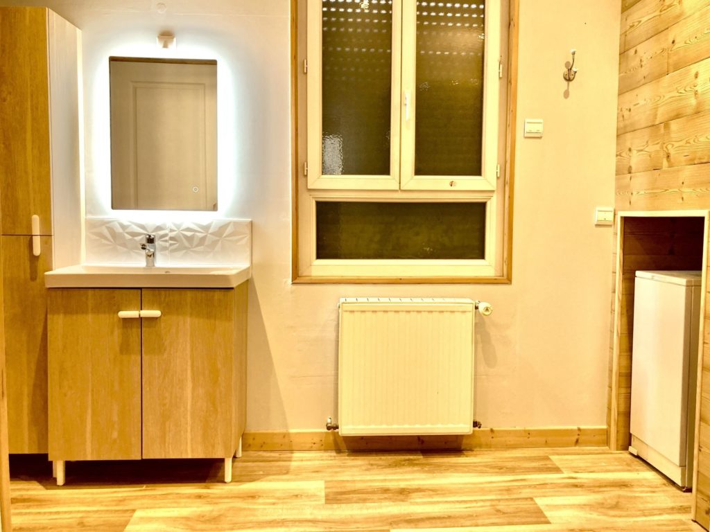 Premier étage : vaste pièce à vivre avec salon, cheminée, charpente apparente, espace repas et cuisine équipée, 4 chambres, 3 salles de douche chacune équipée de WC, 1 salle de bains avec WC, et 3 balcons offrant une vue imprenable sur les massifs des Fiz et des Aravis.