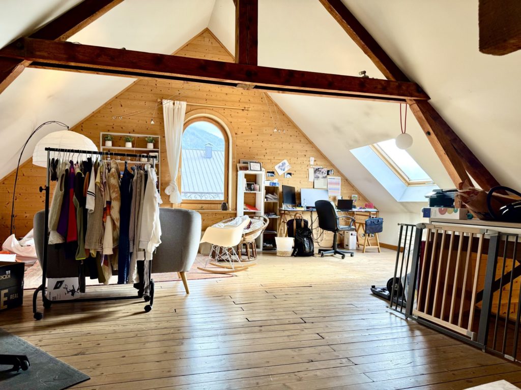 2e étage : Une chambre, un grand bureau (ou pièce polyvalente) et un grenier.