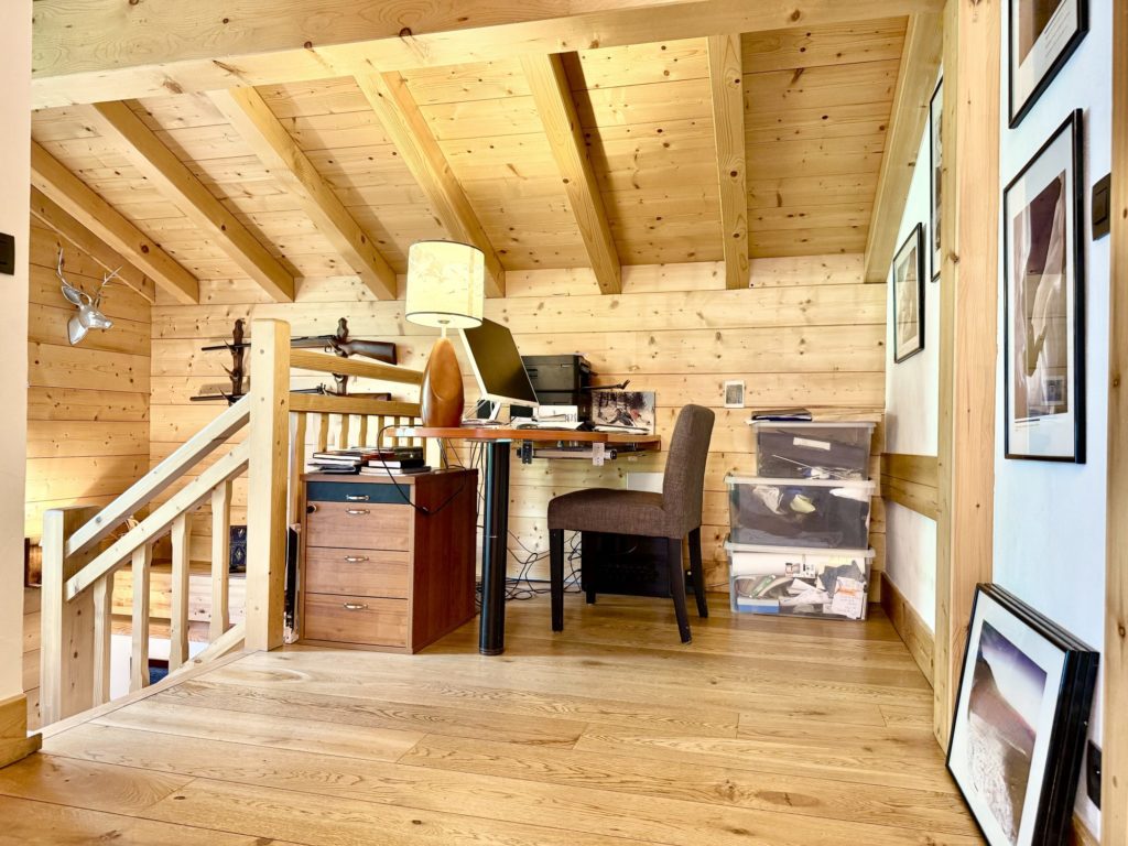 À l’étage : Deux chambres, un espace bureau/mezzanine et une salle de bains avec WC.